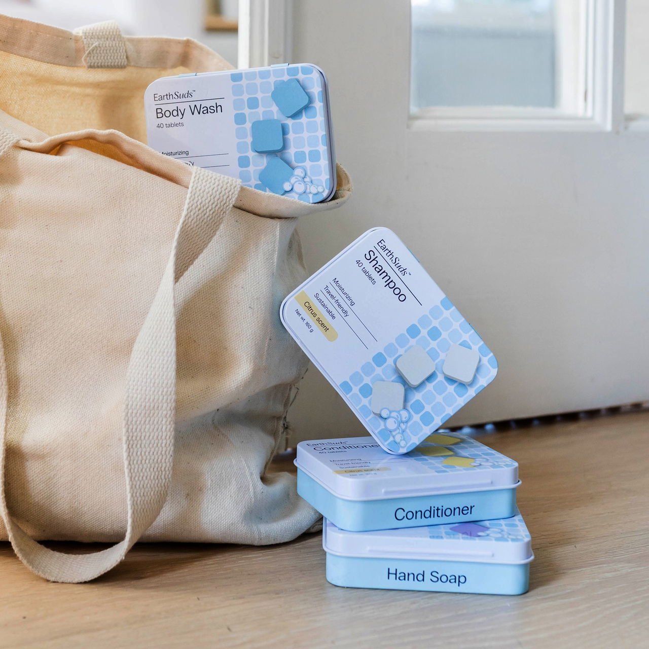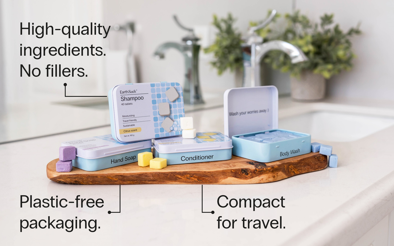 The idea for EarthSuds came on vacation, after seeing a beach littered with plastic toiletry bottles. Over 5.7 billion bottles end up in our landfills and waterways every year.